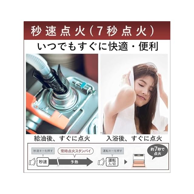 【点火時間短縮】従来品(2020年以前のモデル)の通常点火時間75秒を約20秒短縮し、約55秒で点火できるようになったことで、さらに快適にお使いいただけます。また、利用シーンに合わせて、運転スイッチONから約7秒で点火する「秒速タイマー」「秒速点火」もお選びいただけます。