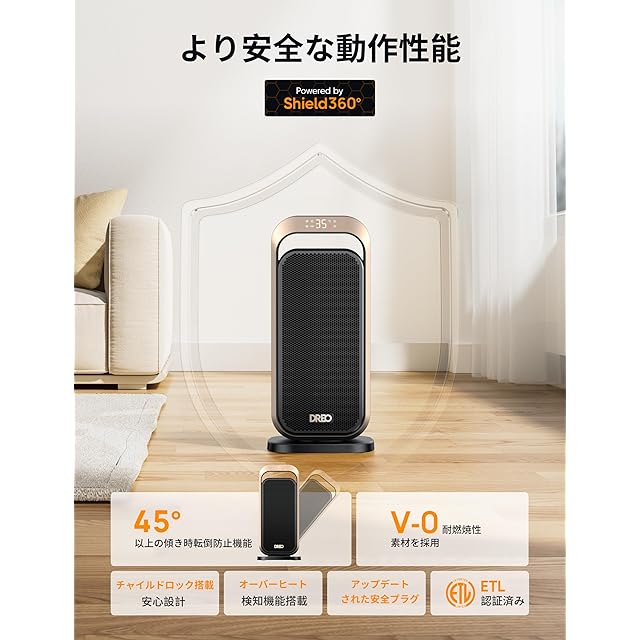 【高安全性・ETLの認証】:DreoのルームヒーターはETL認証、V0難燃素材を使用しているほか、転倒検知センサーにより、オーバーヒート防止機能、安全プラグといった、12時間タイマーの安全機能を搭載。更に、暖房器具 省エネは前回電源OFF時の設定で運転するようにメモリー機能を搭載され、いちいちセットする余計な工夫がいらない、生活でもっと便利になります。