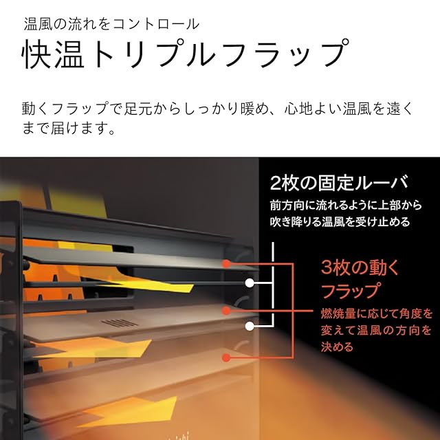 【トリプル宣言 快温】快温トリプルフラップで温風の流れをコントロール。足元からしっかり暖め、心地よい温風を遠くまで届けます。大火力時には、フラップを上向きに固定し、まっすぐ前へ吹き出すことで、温風を遠くまで届けます。小火力時には、フラップを下向きに固定し、吹き上がりを少なくすることで、足元からしっかり暖めます。風当たりをコントロールするスイング機能は、フラップが上下にスイングすることで、温風がゆらいで広がり、やさしく暖めます。快温トリプルフラップ機種(FW-5724SGX)と固定ルーバー機種(FW-5724LS)小火力時に噴出口付近を比較した場合、温風の距離と面積が約30%アップ。