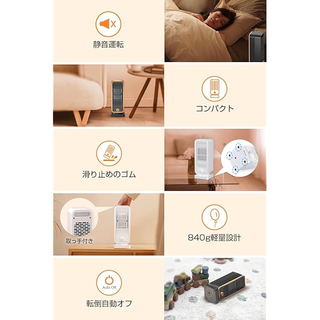 【軽量コンパクト×取っ手付き×超静音、快適性抜群】大型ヒーター並みの送風力を持ちながら、わずか約840gの軽量ボディを実現しました。サイズは10.3×10.5×26.2cmとコンパクトで、従来品と比べて体積80%・重量50%をカットしました。狭いスペースにもすっきり設置でき、背面の取っ手で持ち運びも簡単です。女性や高齢の方でも片手で楽に移動でき、リビング・寝室・脱衣所など必要な場所にサッと置いてお使いいただけます。さらに45dB以下の静音設計で、図書館の中にいるような穏やかな静けさを実現しています。読書や作業中はもちろん、就寝時にも音が気にならず、やさしい温風に包まれながら深い眠りを誘います。静けさと快適さを両立した、理想的な冬の相棒です。