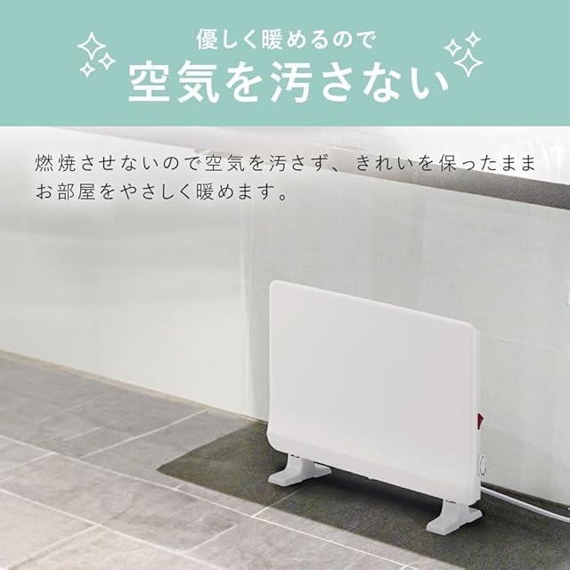 省スペースに設置できる高さ28cm、幅38.2cm。壁掛け対応も可能なヒーターです。