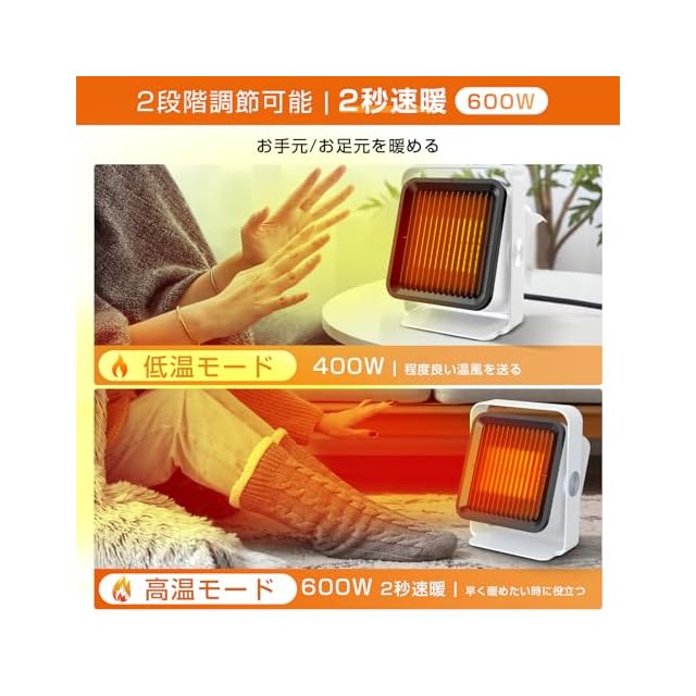 【2段階出力・2秒速暖】本セラミックファンヒーターは弱温風(400W)、強温風(600W)二つのモードが切り替え可能、温度や環境に応じた最適な暖房を提供します。強温風(600W)で約2秒速暖可能、早く暖めたい時に役立つ。