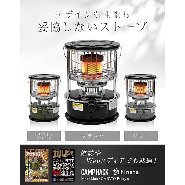 【⾒た⽬以上の、機能性を。】軽くて⼩さいので、キャンプなどへの持ち運びが便利なうえ、⾼出⼒3.0kWhの優れた暖房性能、寒い冬などでも⼤活躍。さらに、約18 時間の連続燃焼も可能で、⻑時間のアウトドアイベントなどにも重宝します。