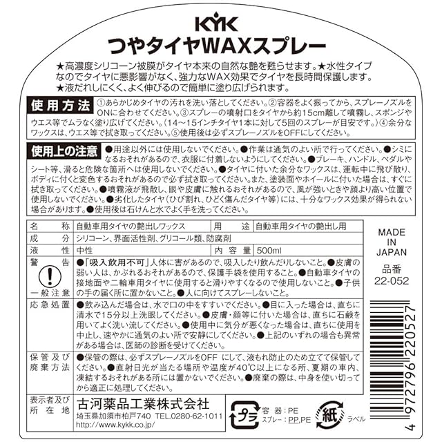商品名:《新品未開封》古河薬品工業(KYK) つやタイヤワックススプレー500ml