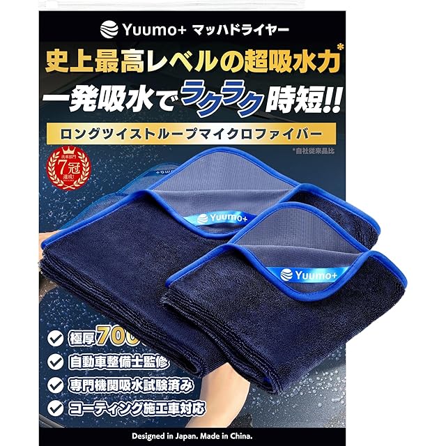 《新品未開封》【整備士監修x極厚700GSM】 洗車 タオル 『"感動レベル"の一発吸水!!』 マイクロファイバークロス 車 大判 超吸水 プロ仕様 Yuumo+(ユーモプラス) マッハドライヤー M(60×50cm)1枚+L(90×70cm)1枚セット(青+青)