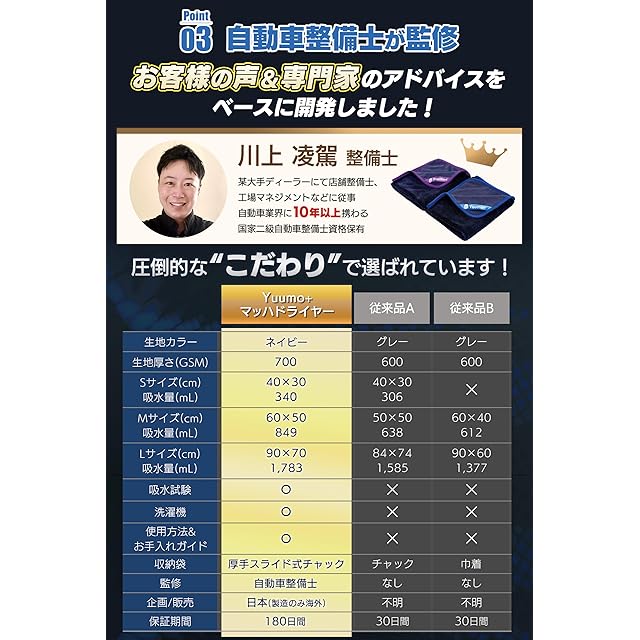 ✅【史上最高レベルの超吸水力*】極厚700GSM×ツイストループ製法のマイクロファイバータオルが水滴を一瞬でキャッチし、水垢を残さず、愛車の表面を素早く拭き取ります。吸水量はMサイズ:849mL、Lサイズ:1,783mLと従来品(600GSM)比+111%アップ、市販マイクロファイバークロス比+232%、綿タオル比+311%(一般社団法人ボーケンにて吸水試験実施、*当社従来品比)。タオルの縁部分は、柔らかくて車の表面を傷つけにくい弾力性の高いナイロン生地で縫製。塗装やコーティングなどの表面を傷つける心配もありません。 ✅【拭き上げ時間を約1/3にラクラク時短化】独自のロングツイストループ製法で、市販マイクロファイバークロスと比較し、優れた吸水力・耐久性を実現。拭き上げ時間は市販マイクロファイバークロスと比較し、約1/3に短縮。洗車時間短縮&疲労軽減でお手軽に洗車できるため、愛車をいつもピカピカな状態に保てます。いつものドライブがより楽しくなり、あなたのカーライフをさらに充実させること間違いなし。 ✅【自動車整備士が監修】某大手ディーラーの現役自動車整備士「川上 凌駕」氏が監修。機能性・サイズ・品質・デザインなどのアドバイスをもらい、改良を重ねた結果、圧倒的なこだわりの洗車タオルが製品化されました。川上整備士コメント「吸水性は申し分なく、隙間に入った水も吸い取ってくれます。柔らかさも大きさもちょうど良く、拭き上げの時短化により疲労も軽減できるのでオススメです!」と大絶賛。プロ推薦の大判洗車用タオルです。 ✅【商品詳細】●同梱物:洗車タオル、使用方法&お手入れガイド×1、厚手スライド式チャック収納袋×1 ●Mサイズ:横60×縦50cm ●Lサイズ:横90×縦70cm ●生地厚さ:700GSM ●カラー:タオル生地:ネイビー・縁:ブルー ●素材:ポリエステル80%・ナイロン20% ●お手入れ方法:洗濯機・手洗い〇、乾燥機×、中性洗剤〇、漂白剤・柔軟剤×、洗濯後は風通しの良い場所で陰干しで乾燥させてください(天日干しの場合はタオル地を内側にして乾燥させてください)。 ✅【安心の180日間品質】アフターサポート用の公式LINE窓口(日本人対応)を用意しており、サポート体制は万全です。万が一、商品に不具合がございましたら、直ぐにご連絡ください。最後まで誠心誠意対応させていただきます。