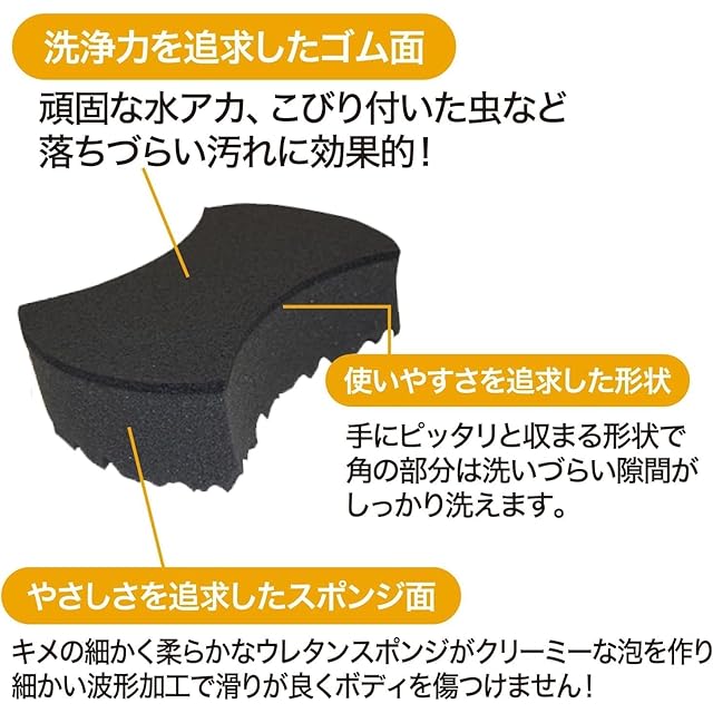 ウォッシングスポンジ:塗装にやさしい、キメ細かく柔らかなウレタンスポンジ素材を採用し、細かな波形(プロファイル)加工を施した、塗装面がデリケートなコーティング施工車にも適しています。
