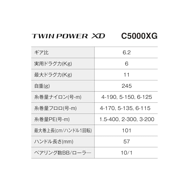 糸巻量:ナイロン(号-m) 4-190、5-150、6-125 / フロロ(号-m) 4-170、5-135、6-115 / PE(号-m) 1.5-400、2-300、3-200