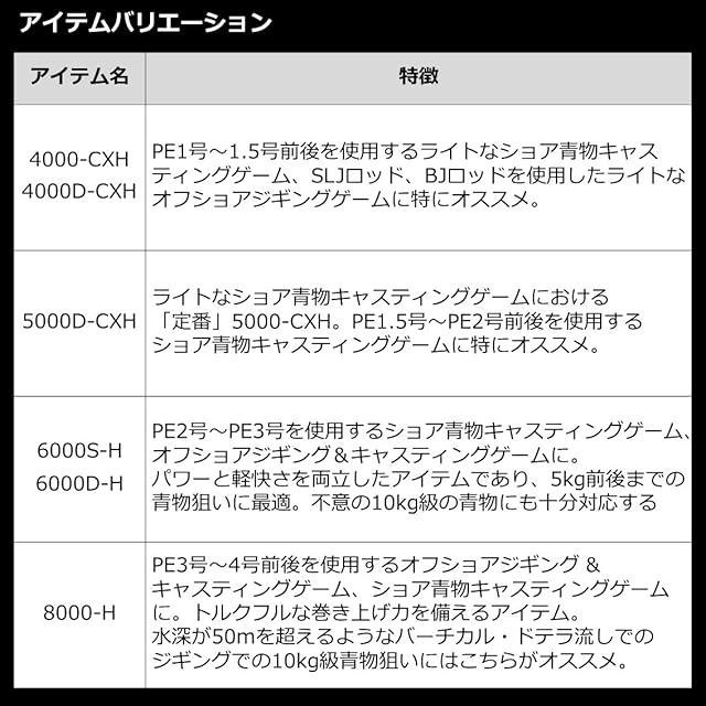 巻取り長さ(cm/ハンドル1回転):101 / ギア比:5.7 / 最大ドラグ力(kg):12