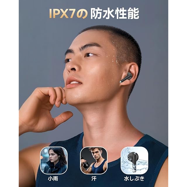 【IPX7防水性能】IPX7 防水防汗。高い防水性能を実現した完全ワイヤレスイヤホンは、ジムやランニング、フィットネスなどのスポーツ中、雨の日でも安心して使用できます。 ※ご注意:充電ケースは防水仕様ではありません。