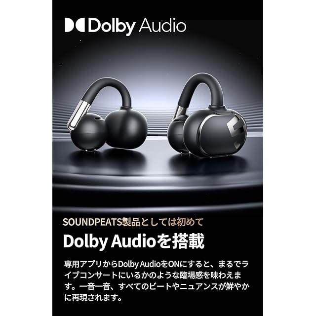 【SOUNDPEATS×Dolby Audio、映画も大迫力】 Clip1がSOUNDPEATS製品としては初めて最先端の音響テクノロジー・Dolby Audioに対応しました。Dolby Audioを有効にすると、一般的なステレオ音源が立体的な広がりを持った臨場感あふれるサウンドに変貌します。新開発の軽量コンパクトな12mmデュアルマグネットドライバーシステムは、より大口径のドライバーに比肩する力強いサウンドを実現、映画や音楽ライブの音も圧倒的な没入感でお楽しみいただけます。※「PeatsAudio」アプリからDolby Audio機能を有効にすると、没入感のあるリスニング体験をお楽しみいただけます。