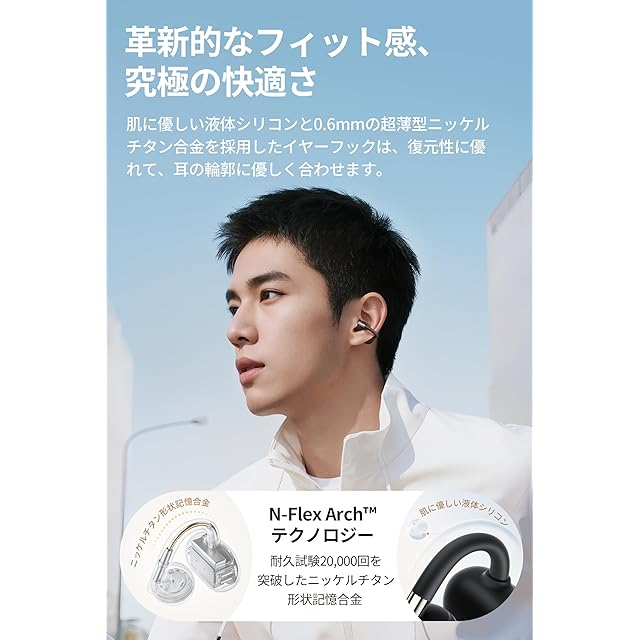 【 圧迫感・違和感なし、新次元の装着感】 耳を塞がないオープンイヤー設計により、音楽を楽しみながらも周囲の音(車の接近、駅のアナウンス、お子様の声など)を自然に聞き取ることが可能です。肌に優しい液体シリコンとわずか0.6mmの超薄型ニッケルチタン合金を採用したN-Flex Arch構造が、あらゆる耳の形状に柔軟にフィットします。メガネやマスク、ヘルメットなどの干渉を受けない、安定した装着感を実現します。片耳わずか5gの超軽量設計と人間工学に基づくカーブデザインで、長時間装着しても快適です。通勤・通学や運動、家事に至るまで、いつでも快適な“ながら聴き”が可能です。