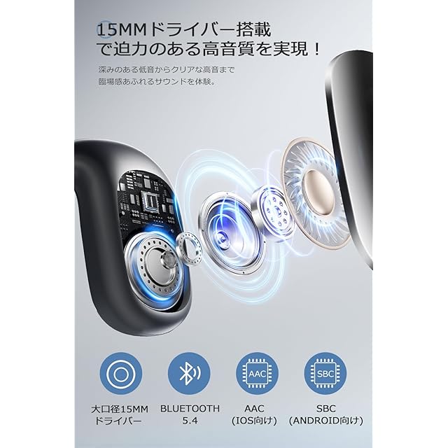 【15mmドライバー搭載&ノイズキャンセリングで高音質と通話を両立】 迫力あるサウンドを実現する15mmの大口径ドライバーを搭載。低音はしっかり重く、高音はクリアで伸びやか。ジャンルを問わず、音楽を臨場感たっぷりに再生します。通話面ではCVC8.0ノイズキャンセリングに対応しており、騒がしい場所でもクリアな音声を維持。ハンズフリー通話にも対応し、耳を塞がないイヤホンとしてスマホに触れず通話が可能。仕事中の会議や、オンライン授業、移動中の通話にも最適なBluetooth イヤホン。オープンイヤーイヤフォンならではの自然な聞こえと、ワイヤレスイヤホンとしての性能を両立しています。