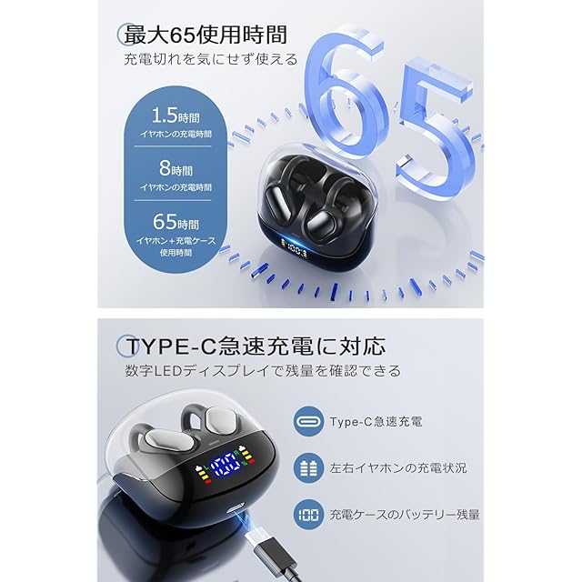 【65時間のロング再生&LEDディスプレイ付き充電ケース】 一度のフル充電でイヤホン単体が約8時間再生、さらにケースとの併用で最大65時間まで連続使用可能。長距離移動や旅行、出張、通勤通学などでも安心です。急速充電に対応したType-Cポートで充電もスピーディー。加えて、充電ケースにはデジタルLEDディスプレイを搭載しており、左右のイヤホンとケースのバッテリー残量を一目で確認可能。ブルートゥースイヤホンとしての使いやすさと利便性を両立した一台で、日々の音楽や通話がより快適に。耳挟み型イヤホンとしての携帯性にも優れており、どこへでも手軽に持ち運べます。