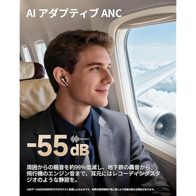 【ブランドトップクラスの静寂性、AI アダプティブ ANC】内蔵マイクで周囲の雑音レベルや装着状況をリアルタイムにチェック、AIの働きによりアクティブノイズキャンセリングの効きの強さを変動させる「適応型アクティブノイズキャンセリング」に対応しました。可聴域で最大55dB(当社ラボでの測定値)というノイズ低減効果を実現しました。また、防風メッシュが風ノイズを効果的に抑制し、L型キャビティ設計で風の流れを最適化にします。さらに、風ノイズ低減アルゴリズムが風切音を自動検知し、気にならないレベルに低減します。電車や車の走行音、街中の雑踏や人の話し声といった環境音が気になる場所でも静寂をつくり出し、かつてない没入感を実現します。