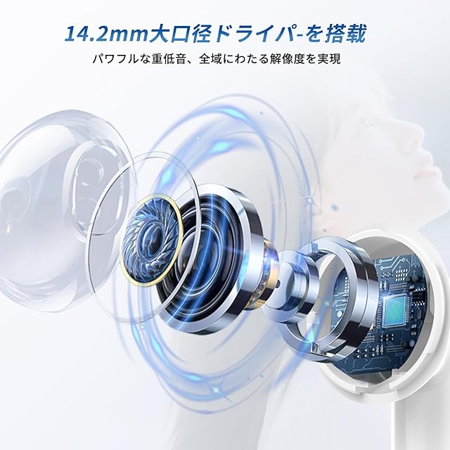 Hi-Fi重低音ステレオ&臨場感あふれるサウンド:イヤホン ワイヤレス 14.2mmの大口径ダイナミックドライバーを採用し、深みのある重低音、伸びやかな中音域、澄んだ高音域を忠実に再現。イコライザーでの補正を必要とせず、自然で迫力ある音質を実現します。まるでコンサート会場や映画館にいるような没入感を体感でき、音楽鑑賞はもちろん、映画やゲームのサウンドもリアルに楽しめます。