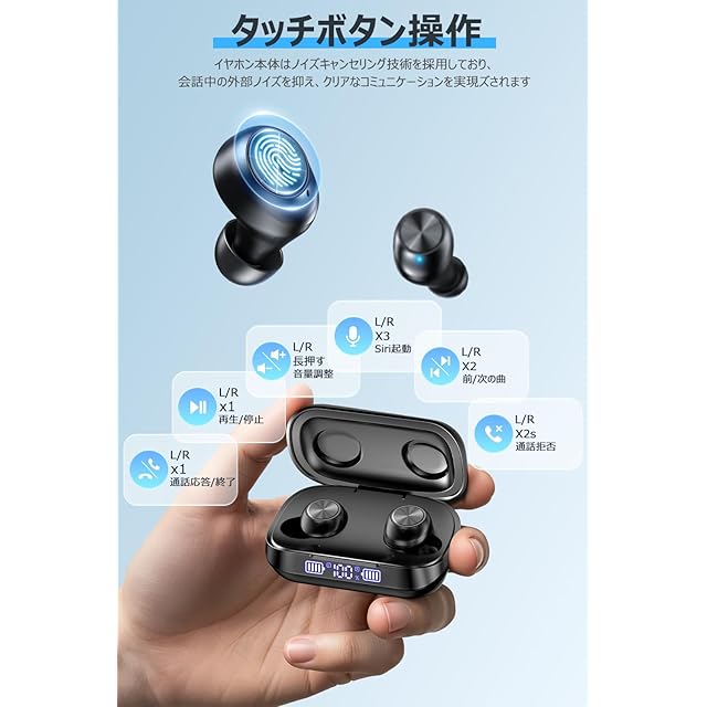 本bluetoothイヤホンはタッチコントロール対応で、ポケットからデバイスを取り出しなくても音量調整/音楽再生/一時停止、通話/終了/拒否/次の曲/前の曲/Siri起動などの簡単な操作ができます。