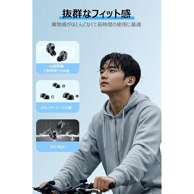 【タッチボタン】本bluetoothイヤホンはタッチコントロール対応で、ポケットからデバイスを取り出しなくても音量調整/音楽再生/一時停止、通話/終了/拒否/次の曲/前の曲/Siri起動などの簡単な操作ができます。【IPX7防水】IPX7防水性能により、どちらの方向からの水の飛沫も入られません。汗や塵を防ぎ、ランニング、フィットネス、アウトドアスポーツなど運動中に汗をかいても大丈夫です。※ご注意:充電ケースは防水仕様ではありません。【パッケージ内容】パッケージ内容:充電式収納ケース、Bluetoothイヤホン*2、Type-C充電ケーブル、イヤーピース×3ペア(Mが初期装着)、日本語取扱説明書。