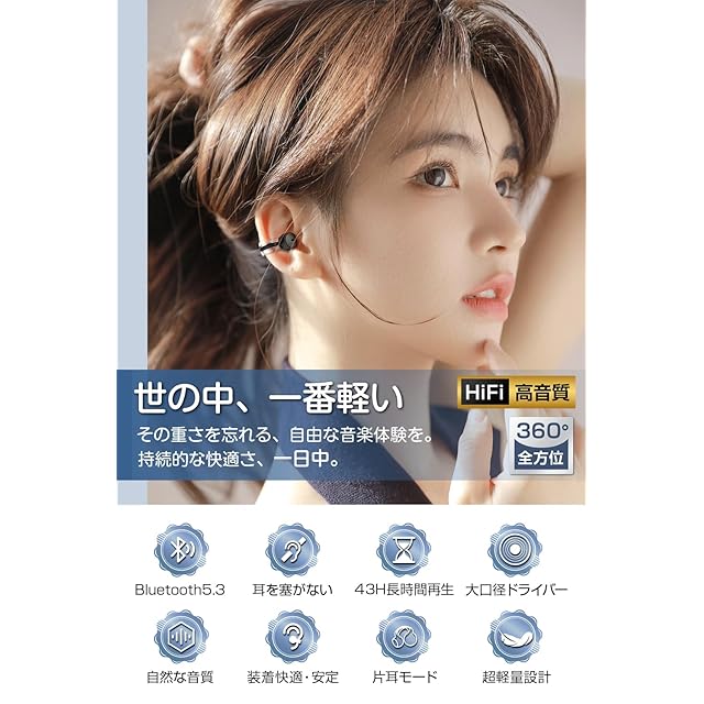【イヤーカフ式新感覚|耳に挟むだけで装着完了】 ワイヤレスイヤホン には従来のカナル型とは異なり、耳をふさがないイヤーカフ構造を採用。耳に挟むだけの簡単装着で、 骨伝導 や空気伝導イヤホンのような開放感を実現します。外音も自然に聞こえるため、通勤・通学・散歩時の安全性も確保。長時間でも圧迫感なく、耳が痛くならない新感覚の Bluetoothイヤホン です。