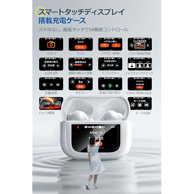 【スマートタッチケース、14機能簡単操作でイヤホン探しも安心】 従来のワイヤレスイヤホンケースとは違い、スマートタッチディスプレイ搭載充電ケースを採用。スマホなしで14機能(音楽切替/ノイズキャンセリング/外音取込/音量調整/イヤホン探し/イコライザー設定/ロック画面壁紙/ライト点灯/タイマー/画面明るさ調整/言語切替/日時設定/ロック解除/バッテリー残量表示)をサッと操作可能。 イヤホン探し機能で万が一紛失しても安心。通勤電車内やスポーツ中でもケースだけで直感操作でき、小型/軽量なデザインで携帯性も抜群。毎日の使い心地が格段に向上します。