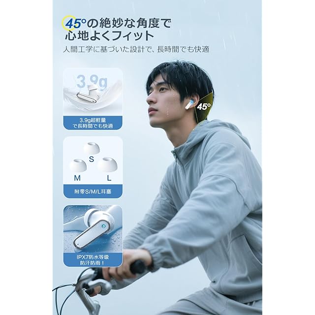 【最大50時間再生、IPX7防水&超軽量設計でスポーツ・通勤・通学・WEB会議にも最適】 イヤホン bluetooth本体は約6〜8時間、充電ケース併用で最大50時間再生。LEDディスプレイで現在のイヤホンと充電ケースのバッテリー残量がひと目で確認可能。わずか3.9gの超軽量設計と45°人体工学フィットにより、長時間使用でも疲れにくい快適な装着感を実現。さらにIPX7防水仕様で、汗をかくジムやランニング、突然の雨の中でも安心。 スポーツ/通勤/通学/WEB会議など毎日のさまざまなシーンで頼れるワイヤレスイヤホンとして活躍します。