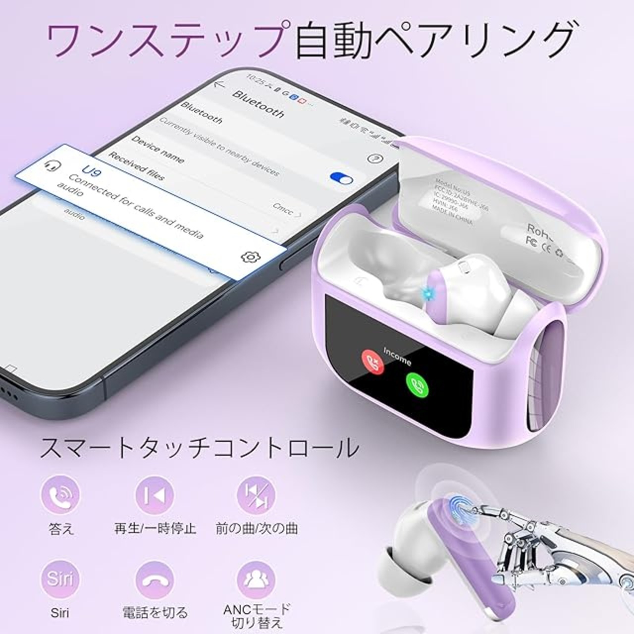 多機能スマートタッチスクリーン:このタッチスクリーンイヤホンにはカラータッチディスプレイが搭載されています。イヤホン本体または充電ケースから、音楽の再生、曲の切り替え、通話の応答と終了、ノイズキャンセリングモードの有効化など、様々な操作が可能です。さらに、タッチスクリーンには、音量調整、カメラ操作、7言語切り替え、壁紙切り替え、画面の明るさ調整、イヤホン検索、懐中電灯、タイマーなどの機能も搭載されています