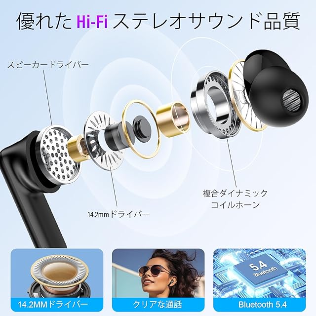 Bluetooth 5.4 & 透明モード:このイヤレスイヤホン、先進のBluetooth 5.4テクノロジーを搭載しています。Bluetooth 5.3と比較して、Bluetooth 5.4は速度、効率、安定性、音質などが大幅に向上しています。さらに、透明モードも搭載されており、運転中や運転中に通話や音楽を聴きながら周囲の音を聞きやすく、安全性を確保します