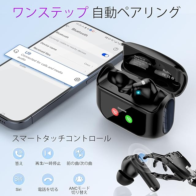 多機能スマートタッチスクリーン:このタッチスクリーンイヤホンにはカラータッチディスプレイが搭載されています。イヤホン本体または充電ケースから、音楽の再生、曲の切り替え、通話の応答と終了、ノイズキャンセリングモードの有効化など、様々な操作が可能です。さらに、タッチスクリーンには、音量調整、カメラ操作、7言語切り替え、壁紙切り替え、画面の明るさ調整、イヤホン検索、懐中電灯、タイマーなどの機能も搭載されています