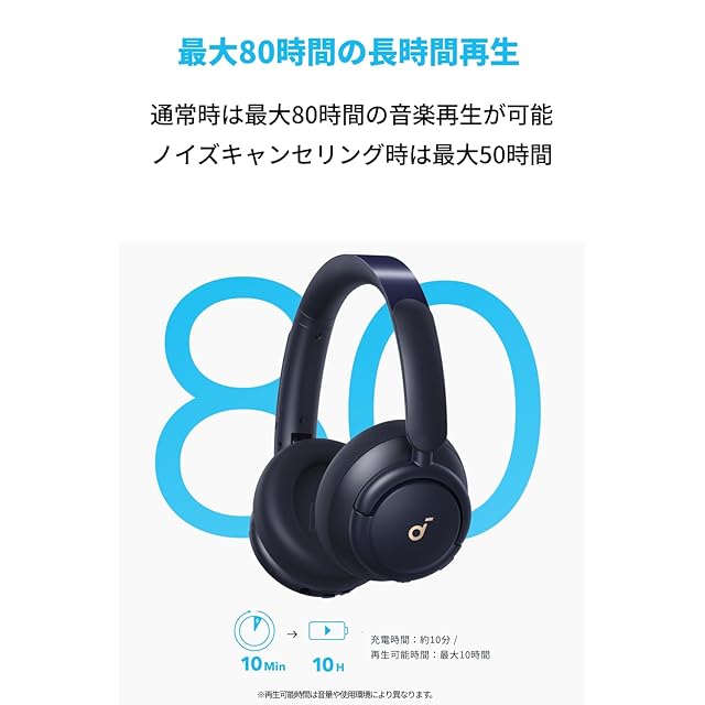 最大80時間の長時間再生:通常時は最大80時間の音楽再生が可能。ノイズキャンセリング時は最大50時間。