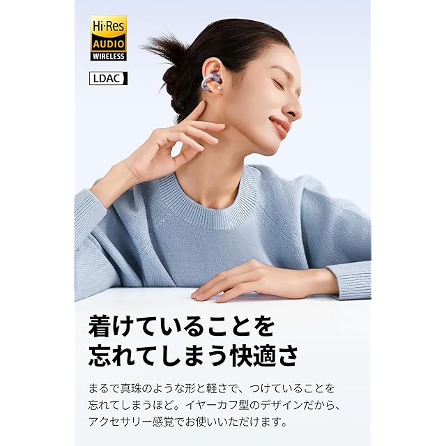 【ついにLDAC対応!クリップ型でもハイレゾ再生】最新バージョンのCCイヤーカフは、Bluetoothの標準オーディオコーデック(SBC)と比較して最大約3倍※の情報量を持つ「LDAC」に対応しました。LDACに対応した端末でご利用いただくと、ハイレゾ音源ならではの豊富な情報量を生かした高音質再生が可能になります。本製品は日本オーディオ協会が定めるハイレゾオーディオワイヤレス認証を取得しています。※Bluetooth A2DPのSBC(328kbps、44.1kHz時)との比較。※1「PeatsAudio」アプリでマルチポイント機能をオフにすると、LDACがご利用いただけます。※2 マルチポイント接続中はLDACはご利用いただけません。※3 LDAC使用時はムービーモードをご利用いただけません。<br/>【SOUNDPEATS ブランド初のCCイヤーカフ】SOUNDPEATSの新しいデザインコンセプトを具現化した、ブランド初のCCイヤーカフ型イヤホンがついに登場!真珠から得たインスピレーションと最新のテクノロジーを組み合わせ、「装着感ゼロ!」を目指しつつ、優美なシルエットを生み出しました。C型ブリッジ部分に採用したニッケルチタン製形状記憶合金ワイヤーは、耐久性がありつつも高い弾力性を備えるため、さまざまな耳型にぴったりフィットします。しかも肌に優しい70%液体シリコンで覆われているから装着感は抜群、ほぼ“つけてる感”がありません。<br/> 【耳に挟むだけで聞こえる、「ながら聴き」体験の再定義!】イヤーカフ型のイヤホンだから、アクセサリー感覚で耳の軟骨を挟むだけで、耳の穴を塞がずに音楽を楽しめます。外部の音を完全に遮断しないため、車のクラクションやアナウンスなどの環境音も自然に聞き取れるので、安心してお使いいただけます。音楽を聴きつつ家事をしているときでも、家族と自然なコミュニケーションをとることができます。カナル型イヤホンの蒸れ・痛み・かゆみ、骨伝導型や耳掛け型で起こりがちな耳への負担、サングラスやメガネ、マスクとの干渉といった問題は発生しません。日常生活の様々なシーンで、音楽を聴きながら快適な長時間使用が可能です。<br/> 【左右の区別がないから収納はかんたん、急速充電対応】イヤホン本体は左右の区別がないから、充電ケースへの収納はかんたんそのもの。イヤホンを充電ケースに収納するだけで、イヤホンの左右チャンネルの自動切り替えが完了します。<br/> 【単体6時間連続再生、急速充電対応】イヤホン本体で最大6時間、充電ケースを含めると最大24時間の再生が可能です※。また急速充電に対応し、わずか10分の充電で2時間の再生が可能です。日常生活での使用はもちろん、長距離の移動やアウトドア活動にも適しており、急な充電切れにも安心。※再生時間は音楽再生時の時間であり、音量、再生内容、使用環境によって異なる場合があります。<br/> 【イヤーカフでも音に妥協なし、プロも太鼓判の高音質】CCイヤーカフは12mmデュアルマグネット・ダイナミックドライバーを搭載し、パワフルで繊細なサウンドと広がりのある音場を実現しました。シングルマグネットドライバーと比べ、より強力な磁場で振動板を効果的に駆動します。振動板の応答がより速くより正確になり、音の歪みも軽減され、特に高音と低音の表現において優れた性能を発揮します。日本のオーディオアワードVGP 2025では金賞・コスパ大賞を獲得、プロも太鼓判の音質を極上の装着感とともにお届けします。<br/> 【マルチポイント接続、CCイヤーカフをより便利に】Bluetooth 5.4に対応、安定した接続性と低遅延を実現しました。マルチポイント接続にも対応し、PCで音楽を聞いたり、ビデオ会議の最中にスマホにかかってきた着信へ応答することも簡単です。<br/> 【専用アプリ「PeatsAudio」対応、サウンドのカスタマイズも自由自在】 アプリ「PeatsAudio」ではイコライザーやタッチボタン設定のほか、ファームウェアアップデートでイヤホンを最新の状態に保つことができます。【好みに応じたサウンドモードを自由に選択】低音増強アルゴリズムを採用、「ダイナミックEQ」をオンにすると、より迫力のあるサウンドをお楽しみいただけます。さらに、新機能「ムービーモード」では、独自のアルゴリズムで音源を処理し、まるで映画館やライブ会場にいるかのような、臨場感あふれる立体音響を提供します。