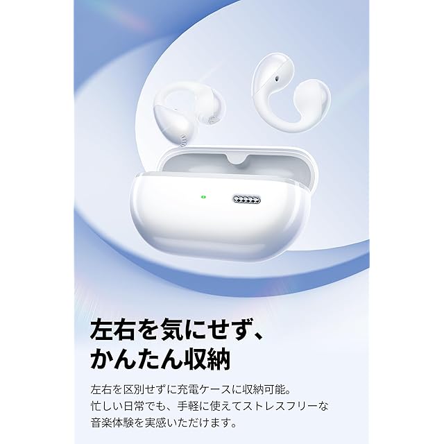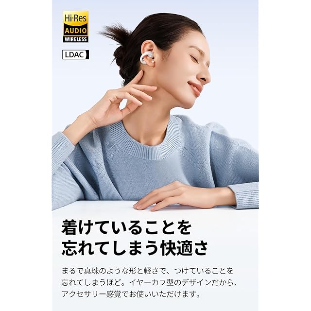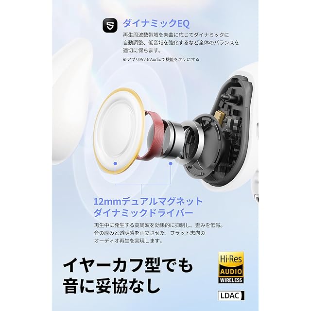 【ついにLDAC対応!クリップ型でもハイレゾ再生】最新バージョンのCCイヤーカフは、Bluetoothの標準オーディオコーデック(SBC)と比較して最大約3倍※の情報量を持つ「LDAC」に対応しました。LDACに対応した端末でご利用いただくと、ハイレゾ音源ならではの豊富な情報量を生かした高音質再生が可能になります。本製品は日本オーディオ協会が定めるハイレゾオーディオワイヤレス認証を取得しています。※Bluetooth A2DPのSBC(328kbps、44.1kHz時)との比較。※1「PeatsAudio」アプリでマルチポイント機能をオフにすると、LDACがご利用いただけます。※2 マルチポイント接続中はLDACはご利用いただけません。※3 LDAC使用時はムービーモードをご利用いただけません。<br/> 【SOUNDPEATS ブランド初のCCイヤーカフ】SOUNDPEATSの新しいデザインコンセプトを具現化した、ブランド初のCCイヤーカフ型イヤホンがついに登場!真珠から得たインスピレーションと最新のテクノロジーを組み合わせ、「装着感ゼロ!」を目指しつつ、優美なシルエットを生み出しました。C型ブリッジ部分に採用したニッケルチタン製形状記憶合金ワイヤーは、耐久性がありつつも高い弾力性を備えるため、さまざまな耳型にぴったりフィットします。しかも肌に優しい70%液体シリコンで覆われているから装着感は抜群、ほぼ“つけてる感”がありません。<br/> 【耳に挟むだけで聞こえる、「ながら聴き」体験の再定義!】イヤーカフ型のイヤホンだから、アクセサリー感覚で耳の軟骨を挟むだけで、耳の穴を塞がずに音楽を楽しめます。外部の音を完全に遮断しないため、車のクラクションやアナウンスなどの環境音も自然に聞き取れるので、安心してお使いいただけます。音楽を聴きつつ家事をしているときでも、家族と自然なコミュニケーションをとることができます。カナル型イヤホンの蒸れ・痛み・かゆみ、骨伝導型や耳掛け型で起こりがちな耳への負担、サングラスやメガネ、マスクとの干渉といった問題は発生しません。日常生活の様々なシーンで、音楽を聴きながら快適な長時間使用が可能です。<br/> 【左右の区別がないから収納はかんたん、急速充電対応】イヤホン本体は左右の区別がないから、充電ケースへの収納はかんたんそのもの。イヤホンを充電ケースに収納するだけで、イヤホンの左右チャンネルの自動切り替えが完了します。<br/> 【単体6時間連続再生、急速充電対応】イヤホン本体で最大6時間、充電ケースを含めると最大24時間の再生が可能です※。また急速充電に対応し、わずか10分の充電で2時間の再生が可能です。日常生活での使用はもちろん、長距離の移動やアウトドア活動にも適しており、急な充電切れにも安心。※再生時間は音楽再生時の時間であり、音量、再生内容、使用環境によって異なる場合があります。<br/> 【イヤーカフでも音に妥協なし、プロも太鼓判の高音質】CCイヤーカフは12mmデュアルマグネット・ダイナミックドライバーを搭載し、パワフルで繊細なサウンドと広がりのある音場を実現しました。シングルマグネットドライバーと比べ、より強力な磁場で振動板を効果的に駆動します。振動板の応答がより速くより正確になり、音の歪みも軽減され、特に高音と低音の表現において優れた性能を発揮します。日本のオーディオアワードVGP 2025では金賞・コスパ大賞を獲得、プロも太鼓判の音質を極上の装着感とともにお届けします。<br/> 【マルチポイント接続、CCイヤーカフをより便利に】Bluetooth 5.4に対応、安定した接続性と低遅延を実現しました。マルチポイント接続にも対応し、PCで音楽を聞いたり、ビデオ会議の最中にスマホにかかってきた着信へ応答することも簡単です。<br/> 【専用アプリ「PeatsAudio」対応、サウンドのカスタマイズも自由自在】 アプリ「PeatsAudio」ではイコライザーやタッチボタン設定のほか、ファームウェアアップデートでイヤホンを最新の状態に保つことができます。【好みに応じたサウンドモードを自由に選択】低音増強アルゴリズムを採用、「ダイナミックEQ」をオンにすると、より迫力のあるサウンドをお楽しみいただけます。さらに、新機能「ムービーモード」では、独自のアルゴリズムで音源を処理し、まるで映画館やライブ会場にいるかのような、臨場感あふれる立体音響を提供します。