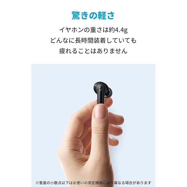 Soundcore | Hear It. Feel It.<br> 心地良く、等身大に音楽を楽しみたいあなたへ贈る、Ankerのオーディオブランド<br><br>製品の仕様<br> 再生可能時間:最大8時間(イヤホン本体のみ) / 最大32時間(充電ケース使用時)<br> 充電端子:USB Type-C<br> 重さ:約47g(充電ケース含む) / 約4.4g(イヤホン本体 片耳)<br> 防水規格:IPX5<br> 通信方式:Bluetooth 5.2<br> Bluetoothプロファイル:A2DP, AVRCP, HFP, HSP<br> 対応コーデック:SBC / AAC<br><br>注意<br><br>・本製品はSoundcoreアプリ非対応です。<br>・お使いの機器とイヤホンを接続する前に、必ずイヤホンのシールを剥がしてからケースに戻して電源を入れてください。<br>・片耳使用時はイコライザー設定は切り替えできません。<br><br>パワフルなサウンド<br>3層構造の大型の10mmドライバーを搭載。コンパクトな小型モデルながら、迫力ある低音を実現します。<br><br>好みのチューニングが選べる<br>バランスの取れた通常モードに加え、低音を増幅させた低音モード、音声をクリアに強調するボーカルモードの3つのイコライザーモードからお好みに合わせてお選びいただけます。<br>※イコライザー設定は、イヤホン本体(右耳)を3回タップして切り替え可能です。<br><br>軽くコンパクトなサイズ感<br>イヤホンの重さは約4.4g。どんなに長時間装着していても疲れることはありません。ケースもコンパクトなサイズで小さなポケットやカバンの中にもすっきりと収まります。<br><br>最大32時間の長時間再生<br>イヤホン本体が満充電の状態で、最大8時間の音楽再生が可能です。また付属の充電ケースを合わせて使えば、最大32時間の連続再生が可能です。また10分間の充電で約1時間の音楽再生が可能です。<br>※再生可能時間は、音量、再生する内容、使用環境によって異なります。<br><br>クリアな音声通話<br>AIノイズリダクション搭載。AIがあなたの音声と周辺のノイズを認識し、ノイズを除去しながら人の声を大きく伝送することで、通話相手はあなたの音声をよりクリアに聞くことが可能です。<br>※この機能は通話時のノイズを除去する機能であり、音楽を聴くときに周囲の雑音を除去するものではありません。<br><br>片耳でもお楽しみいただけます<br>左右のイヤホンの単独使用と両耳での使用を簡単に切り替えることができます。<br>※片耳使用時は、もう片方のイヤホンを充電ケースに戻し、ケースの蓋を閉じてください。<br>※片耳使用時は、イコライザー設定は切り替えできません。<br><br>1ステップで簡単接続<br>充電ケースを開けると自動的にペアリングモードになり、簡単に接続できます。<br><br>安定した接続<br>Bluetooth 5.2に対応し、音飛びを極限まで抑え、安定した接続で音楽をお楽しみいただけます。