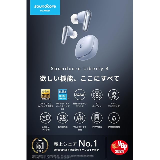 商品名:《新品未開封》Anker Soundcore Liberty 4(ワイヤレスイヤホン Bluetooth 5.3)【完全ワイヤレスイヤホン/ウルトラノイズキャンセリング 2.0 / 3Dオーディオ / ワイヤレス充電/マルチポイント接続/外音取り込み / 最大28時間再生 / ハイレゾ / IPX4防水規格 / ヘルスモニタリング/PSE技術基準適合】スカイブルー
