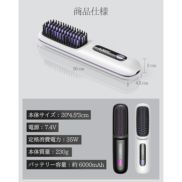 ✅【コードレス&コンパクト】本体は230gまでコントロールできた軽量化したボディです。コンパクトサイズと軽さので、気軽に外出時や旅行先に持ち運べます。コンパクトサイズで細かいニュアンス作りもできます。4台でふんわりストレート、ボリュームアップなど様々なスタイリングを実現するブラシ型ヘアアイロンです。ブラシのように髪をとかすだけで、簡単に自然でツヤのある髪を目指します。