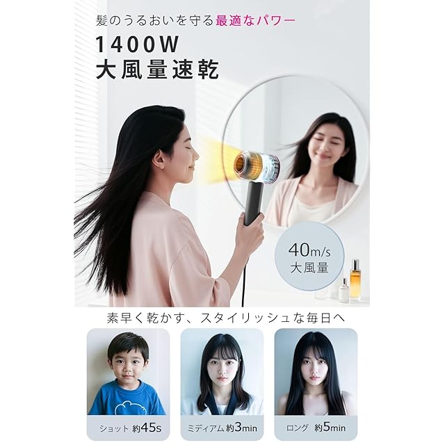 ▶【革命的速乾力!1400Wモーター×40m/s超高速気流】 ヘアドライヤーは高効率1400Wモーターを搭載し、風速40m/sのパワフルな大風量を実現。高温に頼らず髪の根元から一気に乾かし、熱ダメージを抑えながら健康的でなめらかな髪質をキープします。従来モデルに比べ最大約50%の速乾効果(※効果には個人差あり)。忙しい朝でも乾燥とスタイリングを時短し、美しい仕上がりを叶える速乾ドライヤーです。