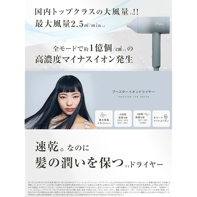 国内トップクラスの大風量✕高温で「速乾力」に特化したドライヤー(2.5m3/minの大風量) 約1億1,000万個/c㎥以上の高濃度マイナスイオンを発生させることで静電気発生量を約32%抑制し、髪の潤いを保ちます。 もう一つの特徴は、温度と風量操作が自由自在な12段階切替。 高温✕大風量はもちろんですが低温✕大風量や高温✕低風量など約12段階の選択が可能に。 それぞれの髪質や目的に合わせた操作ができるのが特徴です。 しかも全モードで高濃度マイナスイオンが発生します。 サイズはコンパクト設計なので、女性でも片手で操作しやすく腕も疲れずらくらく。 パワフル速乾なのにコンパクト。しかもリーズナブルな感動コスパを叶えました。 カラーバリエーションも定番の黒に加え、スモーキーグラデーションカラーの「ムーングレー」「モーヴピンク」もご用意しました。