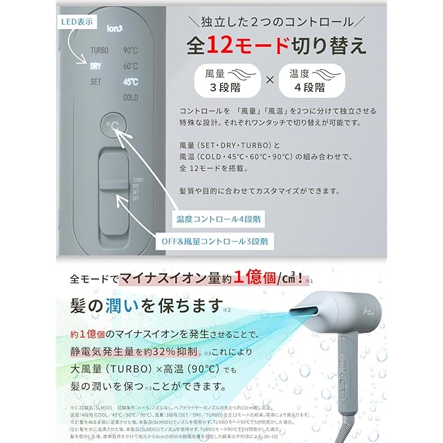 ✅12段階モード設定: 4段階温度設定 ( COLD 40℃ 60℃ 90℃ ) × 3段階風量設定 (TURBO DRY SET ) の 全12段階切替。