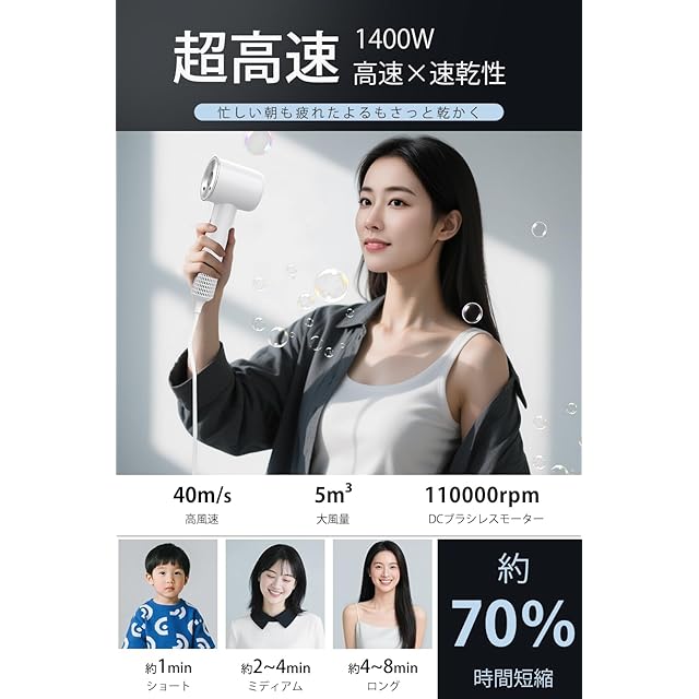 商品名:《新品未開封》【2025トップモデル・超軽量 大風量】 ドライヤー 速乾 3億マイナスイオン 美髪ケア 1400W 高速 スマート温調 4段階温度&3段階風量 過熱防止 携帯用ドライヤー コンパクト 磁吸ノズル付き ヘアドライヤー サロン級 美容師監修 家庭用/旅行用 (ホワイト)