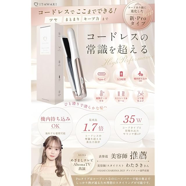 【カミカリスマ2025受賞 表参道stylist推奨モデル】 カミカリスマ2025を受賞した表参道のトップスタイリスト監修のもと、どこでもサロン帰りのような艶髪を叶えるコードレスヘアアイロン「Proタイプ」が誕生。 従来モデル(Liteタイプ)と比べ出力1.7倍・キューティクル保護プレート搭載で、髪へのダメージを抑えながら理想のツヤとまとまりを実現します。 【機内持ち込み対応 × 旅先でも完璧なスタイリング】 国内線・国際線の機内持ち込み基準をクリアしたリチウムイオンバッテリー搭載。 海外出張や旅行中でも安心して持ち運べる設計で、フライト前の身だしなみ直しも可能です。 飛行機でも持ち歩けるプロ品質という新しいスタイリング体験をあなたに。 【速くパワフルに どこでもサロン品質】 従来比1.7倍の高出力ヒーターにより最短50秒で立ち上がり安定した熱をキープ。 独自のキューティクル保護プレートが髪の水分を逃さず、熱ダメージを最小限に抑えてなめらかなツヤ髪へ。 500mlペットボトルよりも短い全長21cmのコンパクト設計で軽量ながらもプロ仕様のスタイリング性能を両立。 【高性能バッテリー&安心設計】 1回のフル充電で30~40分連続使用可能。 液晶ディスプレイで温度・充電残量をひと目で確認でき、165℃/185℃/210℃の3段階温度調整に対応。 誤操作防止の温度ロック機能の安全設計で初心者からプロまで安心して使用できます。 【均一な熱伝導で理想の仕上がり】 クッション構造プレートとセラミックコーティングにより熱を均一に伝達し毛先までムラのない仕上がりを実現。 髪をやさしく包み込むプレート構造でストレートもカールも思いのままにスタイリング。 【2way仕様 × 耐熱ケース付属】 ストレートもカールもこれ1台。 使用後すぐに収納できる耐熱・断熱ケース付きで、外出先や旅行先でも安心して持ち運べます。 【こんな方におすすめ】 外出先でもサロン級の仕上がりを求める方 コードレスでもコードあり級の仕上がりを求める方 海外出張・旅行先でも使いたい方 髪のツヤ・潤いを大切にしたい方