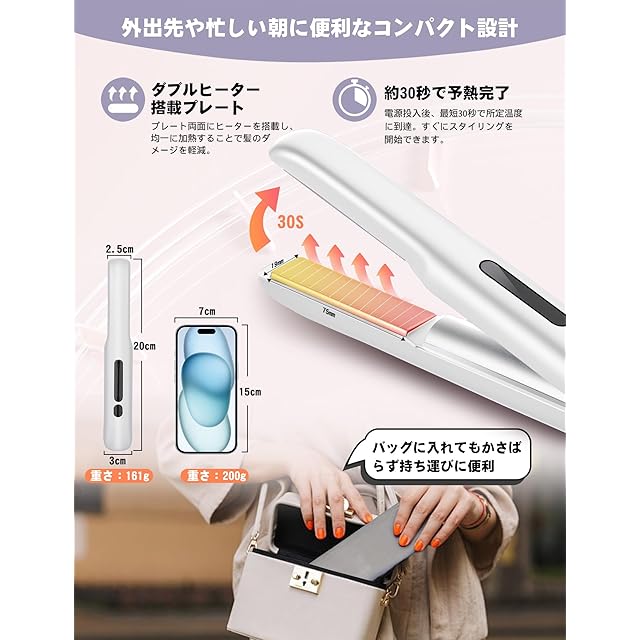 【コードレス&どこでも使える便利さ】コードレス設計、コンセントの位置の不便さを気にする必要がありません。 3200mAh大容量バッテリー内蔵。 40~60分間連続使用可能。場所を選ばずに使えるのが魅力。カフェでの作業前、旅行先のホテル、車の中など、いつでもどこでもサッと前髪や毛先のセットが可能。軽量・コンパクトでバッグにもすっきり収まり、持ち歩きも快適です。