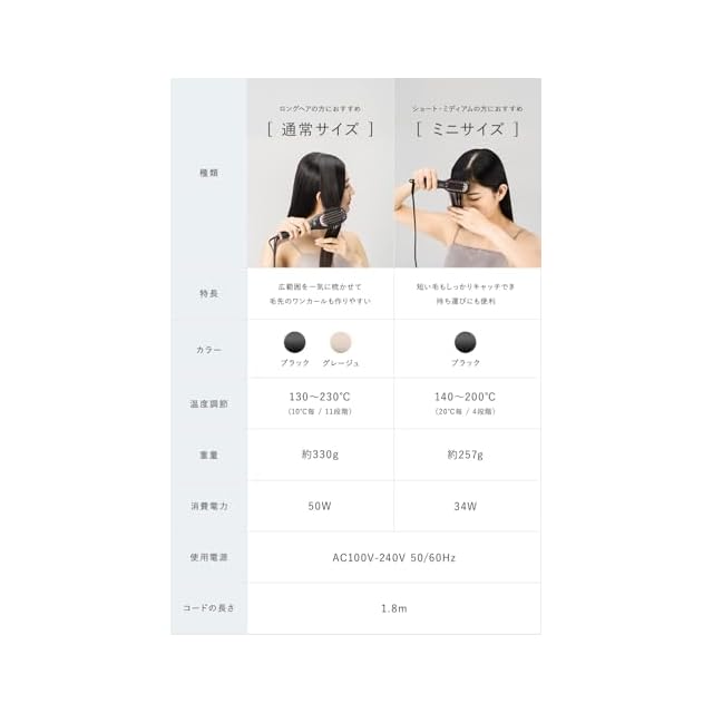 髪質やスタイルに合わせた細かな温度設定ができ、熱によるダメージを抑えつつ、しっかりスタイリングをキープできます。【 通常サイズ 】130~230℃(10℃毎 / 11段階) ・ 【ミニサイズ】140~200℃(20℃毎 / 4段階)