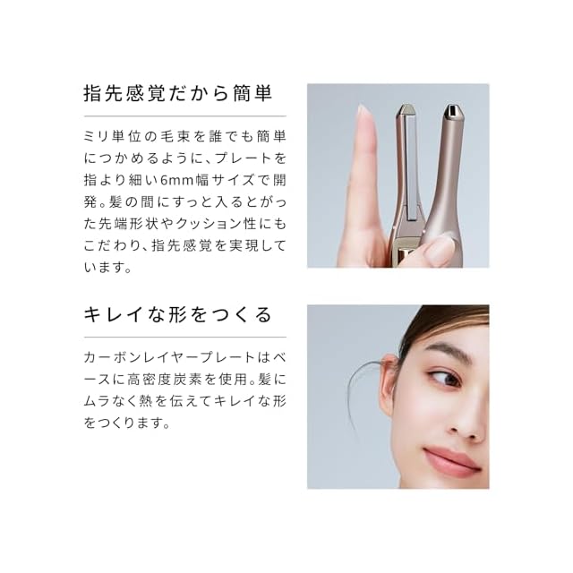 【指先感覚だから簡単】ミリ単位の毛束を誰でも簡単につかめるように、プレートを指より細い6mm幅サイズで開発。髪の間にすっと入るとがった先端形状やクッション性にもこだわり、指先感覚を実現しています。