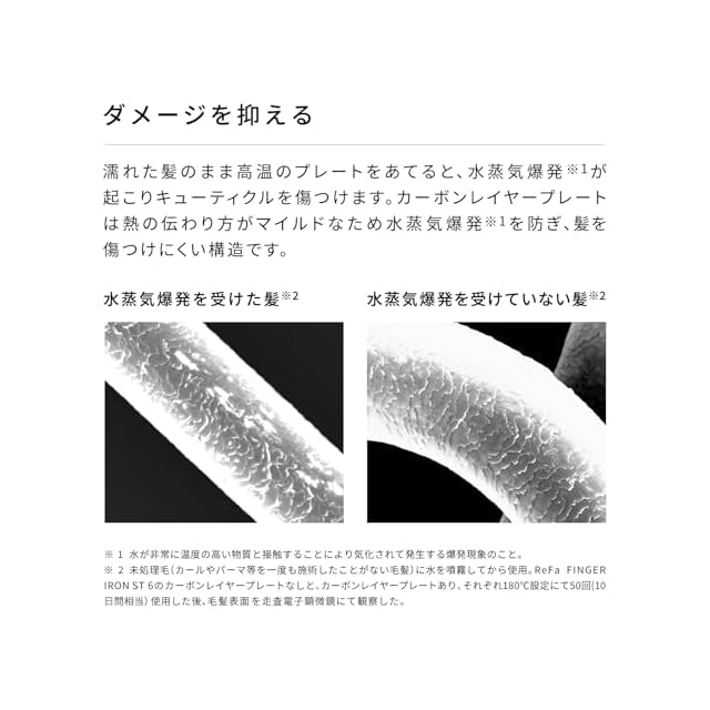 【ダメージを抑える】濡れた髪のまま高温のプレートをあてると、水蒸気爆発※が起こりキューティクルを傷つけます。カーボンレーヤープレートは熱の伝わり方がマイルドなため水蒸気爆発※を防ぎ、髪を傷つけにくい構造です。※水が非常に温度の高い物質と接触することにより気化されて発生する爆発現象のこと