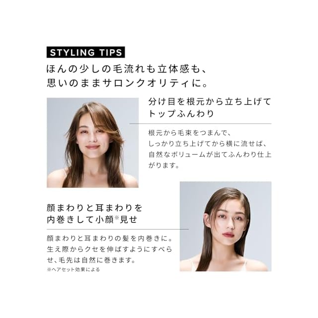 【プロフェッショナルの指先が操るのはミリ単位の毛流れ】サロンでスタイリングしてもらった髪は、前髪に、毛先に、トップに、ほんの少しの毛束の動き「ニュアンス」が美しく存在しています。仕上がりの美しさを左右するのは、ミリ単位の毛束コントロール。わずかな毛束の操り方次第で、もとの髪質や毛量の印象を変えて全体の繊細な動きやエアリー感を足し、立体的なスタイリグを叶えることができるのです。さらに髪をコントロールすることで、印象の良い「こなれ小顔」も実現。そんなプロフェッショナルだけがもつテクニックを研究し、解き明かし、その手を、その眼を、そのセンスを誰もが自由に使えるように再現します。