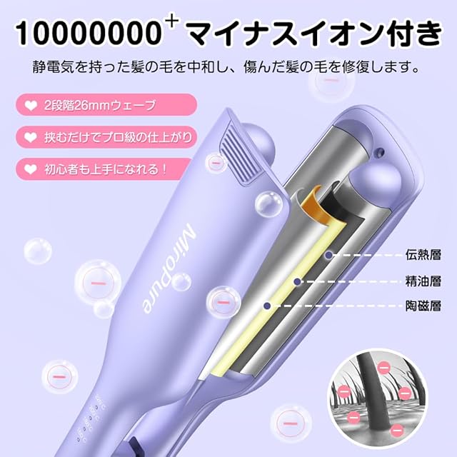 商品名:《新品未開封》MiroPure ヘアアイロン カール ウェーブアイロン 26㎜ 挟むだけで可愛い カールアイロン 実現 160℃~220℃ 千万級マイナスイオン吹出 やけど防止 初心者向けカールアイロン プレゼントも最適 海外対応 PSE認証済 日本語取扱説明書付き 藤色