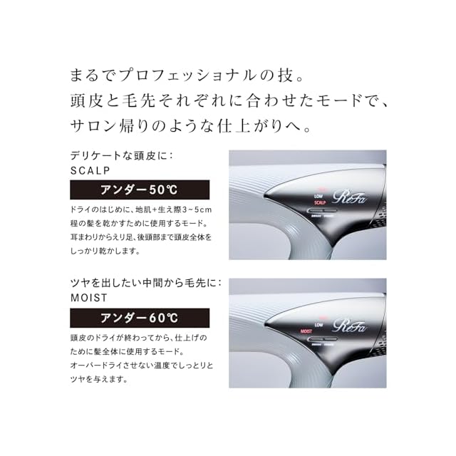 【頭皮と毛先を熱ダメージから守り美しく乾かすセンシングプログラム】ReFa BEAUTECH DRYER SMARTは内蔵センサーが環境温度を感知してそれに合わせたプログラムを選択し、作動させます。このプログラムによって温風と冷風を自動で切り替え、また温風温度自体も微調整。オーバードライを防ぎ、頭皮のため、毛先のための、適した温度を生み出し、正しいドライテクニックへと導きます。