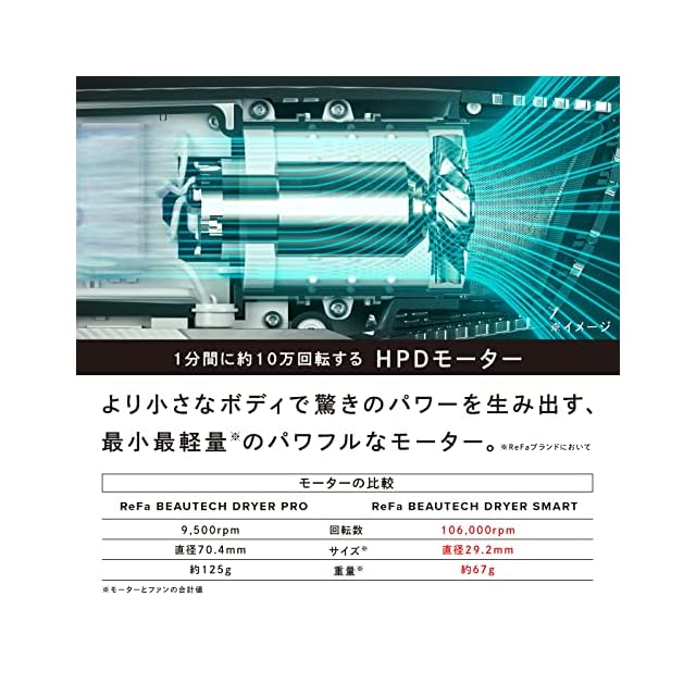 【最小最軽量※のパワフルなモーター】世界的モーターメーカーNidecと共同開発したヘアドライヤーのための最小最軽量※でパワフルな「HPDモーター」を搭載。 ※ ReFaブランドにおいて