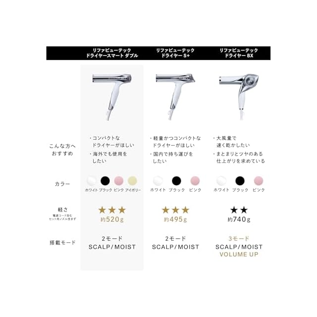 【コンパクトなのに、パワフル。ツヤめき、まとまる仕上がりを、海外でも】速乾※、そして仕上がりの美しさのすべてを同時に叶えるヘアドライヤー。コンパクトなボディから生まれるパワフルな風で、ツヤめきと、美しいまとまりを叶えます。海外でも使えるマルチボルテージ仕様だから理想のスタイルを、旅行先や出張先でも。独自のテクノロジーとメソッドで、いつものヘアドライをもっと美しくなれる時間へ。※当社従来品2021年発売ReFa BEAUTECH DRYER PROとの比較(当社調べ)