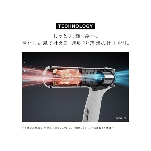 【コンパクトなのに、パワフル。ツヤめき、まとまる仕上がりを、海外でも】速乾※、そして仕上がりの美しさのすべてを同時に叶えるヘアドライヤー。コンパクトなボディから生まれるパワフルな風で、ツヤめきと、美しいまとまりを叶えます。海外でも使えるマルチボルテージ仕様だから理想のスタイルを、旅行先や出張先でも。独自のテクノロジーとメソッドで、いつものヘアドライをもっと美しくなれる時間へ。※当社従来品2021年発売ReFa BEAUTECH DRYER PROとの比較(当社調べ)