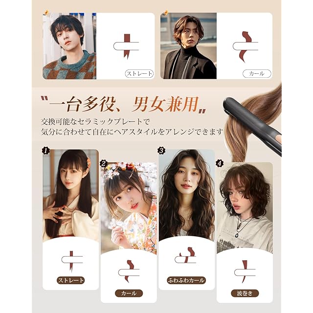 【3WAY カール&ストレート&ウエーブ】このコードレスアイロンは3つ交換可能な滑りよいセラミックプレート付き、髪摩擦が少ないのために、ヘアにダメージもを減少し、さらツヤ髪を手に入れます。「ストレート」「カール」「ボリュームアップ」の3モードを1台で実現、気分に合わせて自在にヘアスタイルをアレンジできます。初心者の方でも思い通りのヘアセットが可能になります。メンズ レディース両用タイプです。(ご注意:飛行機に持ち込みの場合は、事前に航空会社にお電話でご確認ください)